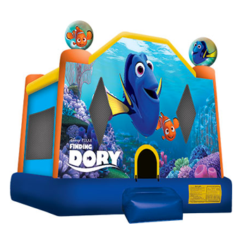 This licensed Finding Nemo jump is a medium-sized bounce house that takes kids to the drop off point with Nemo and friends for hours of bouncing activity. Participants can imagine swimming alongside Nemo and his fish tank pals Gil, Deb and Bubbles, or touring through the ocean with Dory and Marlin, or paling around with little Squirt, the sea turtle. The trio of sharks in recovery, Bruce, Chum and Anchor, round out the cast in this delightful artwork, sure to keep all Finding Nemo fans happy.
